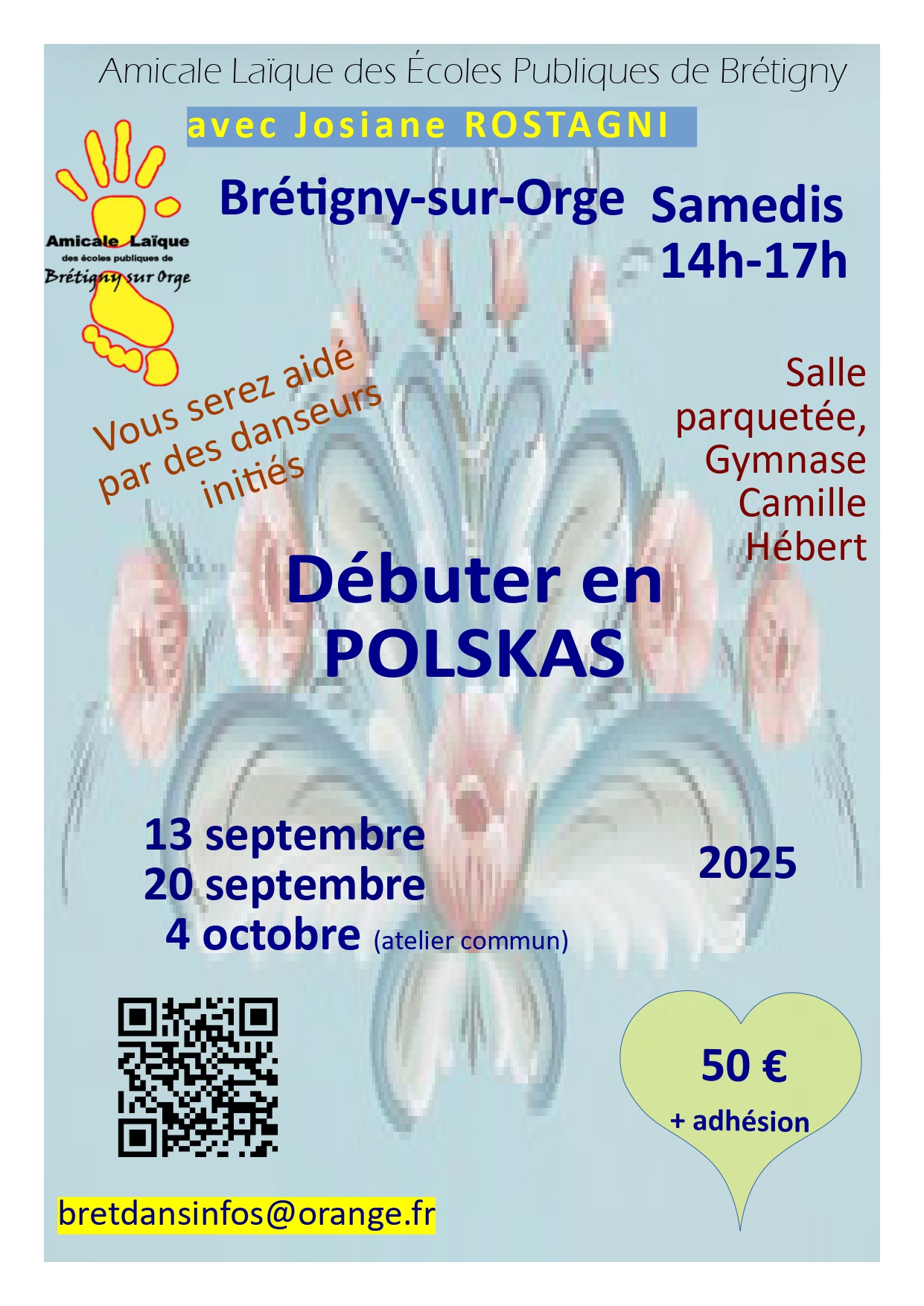 - contacter Josiane *, et envoyer, sous enveloppe affranchie un chèque de 69 € à l’ordre de l’Amicale Laïque Danse (50€ pour les adhérents 2025-2026).